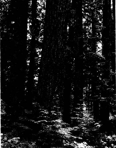 Рис. 32-27. Секвойя (Sequoia sempervirens) — характернейший элемент смешанных лесов западного побережья Калифорнии. Увлажняемые частыми туманами в течение сухого лета и защищенные от холодов близостью к океану, секвойи часто образуют живописные массивы, многие из которых, как изображенный на снимке лес Мьюир-Вудс около Сан-Франциско, сейчас охраняются в национальных парках и заповедниках