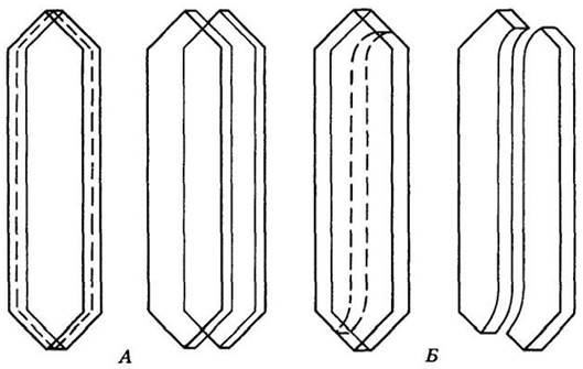 Рис. 23-32. Схема, показывающая направления тангентальной (а) и радиальной (б) распиловки бревна на доски. В первом случае годичные кольца проходят более или менее параллельно широким поверхностям доски, во втором — почти перпендикулярно им