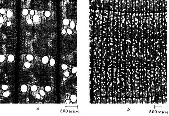 У некоторых двудольных, различия в диаметре сосудов, или «пор», ранней и поздней древесин четко выражены: первые гораздо шире вторых (термин «пора» используется дендроанатомами для обозначения поперечного среза сосуда). Такую древесину называют кольцепоровой (кольцесосудистой) (см. рис. 23-23, А и 23-24, А). У других двудольных сосуды распределены в годичном слое равномерно и почти не различаются размерами. Такую древесину называют рассеяннопоровой (рассеяннососудистой) (рис. 23-23, Б). В кольцепоровой древесине почти вся вода проводится наружным годичным кольцом примерно в 10 раз быстрее, чем в рассеяннопоровой древесине.
