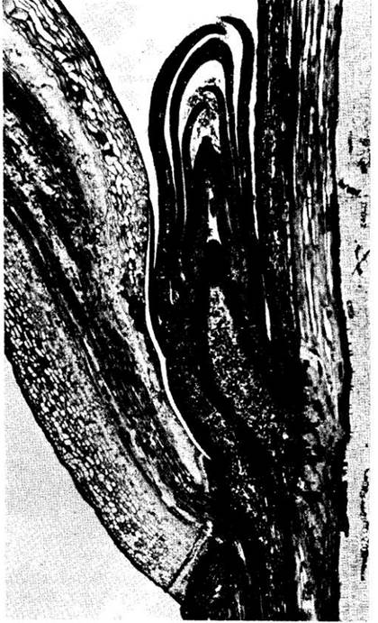 Рис. 25-19. Продольный срез покоящейся пазушной почки клена (Acer). Почка состоит из зачаточного побега, окруженного почечными чешуями