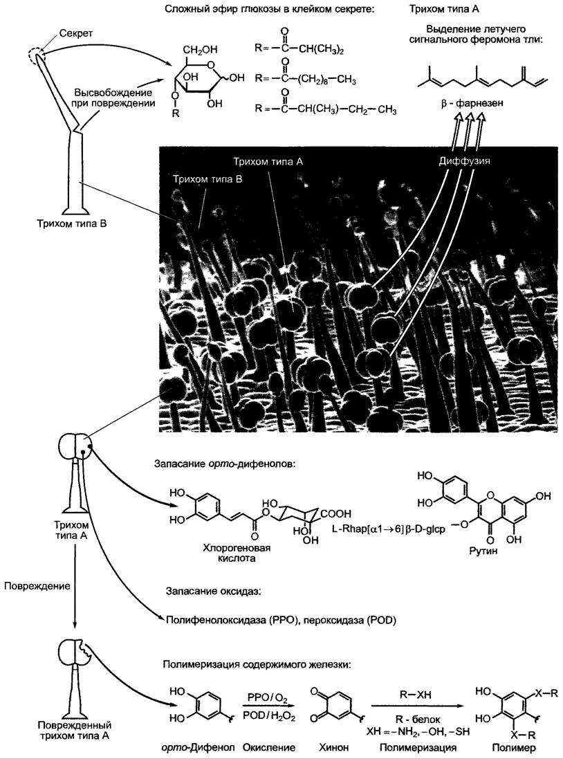 Очень хорошо изучена эффективная конститутивная защита от насекомых у устойчивой к насекомым дикой формы томата, Solanum berthaultii (рис. 9.18), листья которой несут два вида волосков (см. 3.2.5.3): одноклеточные типа В, выделяющие клейкий благодаря сложным эфирам глюкозы сок, к которому приклеиваются насекомые (эти волоски легко обламываются и при этом выделяют еще больше жидкости) и многоклеточные типа А, выделяющие летучее соединение ß-фарнезен. Это отпугивающее вещество, которое используют сами тли в качестве сигнального феромона. Вызванное феромоном интенсивное движение тлей приводит их в контакт с еще большим числом железистых волосков. Если при этом повреждаются трихомы А-типа, то они выделяют большие количества водорастворимых орто-дифенолов и ферментов (полифенолоксидазы и пероксидазы), которые окисляют орто-дифенолы до хинонов. Очень реакционноспособные хиноны легко полимеризуются и при этом реагируют с нуклеофилами (например, —NH2—, —ОН— и — SH—группами белков). Выходящий из трихом А-типа сок полимеризуется за короткое время до смолистой массы, которая склеивает ротовой аппарат и лапки насекомого, так что оно обездвиживается и умирает от голода. В растении орто-дифенолы и оксидазы отделены друг от друга благодаря компартментации.
