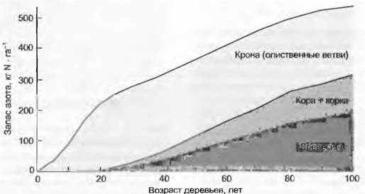 Рис. 13.18. Восстановление запасов азота в биомассе елового леса в Австрии после сплошной рубки. С момента завершения формирования крон (около 25 лет) запас азота в них остается постоянным, запас в стволах продолжает увеличиваться. График наглядно показывает, что в 100-летнем лесу почти половина общего азота сосредоточена в олиственных ветвях