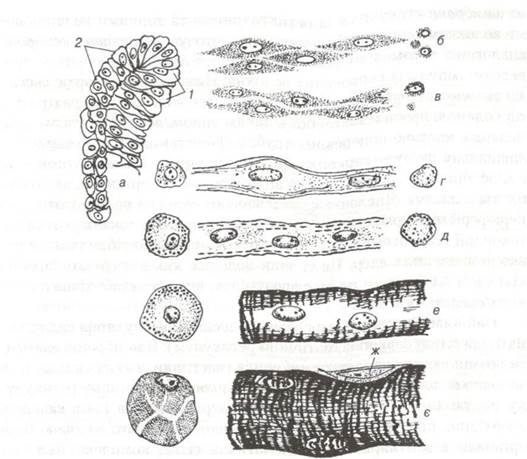 д-м'язова трубочка; е-незріле м’язове волокно; є-зріле м'язове волокно; ж-сполучнотканинна клітина.