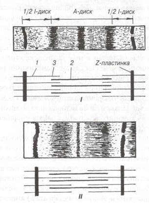 Рис. 63. Саркомер поперечнопосмугованого м'язового волокна в розслабленому (І) та скороченому (II) станах: