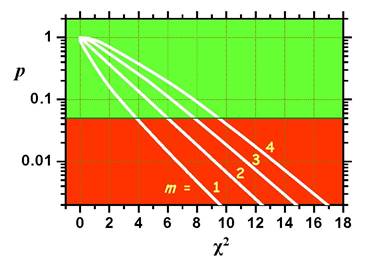 Рис. 3.3. Залежність імовірності р від χ2 для чотирьох значень числа ступенів свободи m.