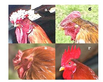 Рис. 3.4. Різна форма гребеня в курей: трояндоподібна (а), горохоподібна (б), горіхоподібна (в), проста (г)