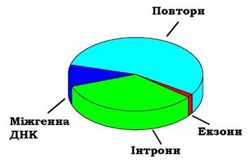 Загальна кількість генів у геномах вищих еукаріотів варіює приблизно від 20 до 30 тис. (табл. 1.1). Як показано на рис. 1.10, кодуючі послідовності цих генів займають лише ~1,5 % геному. Решта припадає на міжгенну ДНК (де розташовані також регуляторні ділянки), інтрони (~30 %) і більше ніж половину геному становлять послідовності, що повторюються.
