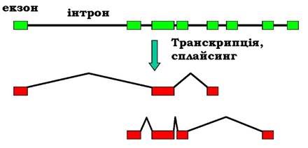 Характерною ознакою генів еукаріотів (на відміну від прокаріотів) є мозаїчний принцип будови кодуючої частини (рис. 1.9): власне кодуюча частина представлена послідовністю окремих змістовних ділянок - екзонів, розділених беззмістовними інтронами. Часто екзони відповідають окремим структурним доменам мультидоменних білків: еволюційне збирання білка з кубиків-доменів може здійснюватись шляхом перетасування екзонів на рівні ДНК. Беззмістовними інтрони є в тому сенсі, що не несуть інформації про кінцевий продукт, але в межах інтронів часто розташовані важливі регуляторні ділянки. Крім того, інтрони деяких генів можуть містити інші гени зі своїми інтронами та екзонами. При транскрипції молекула РНК синтезується суцільно (первинний продукт транскрипції - первинний транскрипт - має у своєму складі екзони та інтрони). Отже, необхідним етапом експресії гена є процес сплайсингу (розділ 2) - вирізання інтронів і зшивання екзонів у кінцевий транскрипт, який уже може бути використаний як матриця для білкового синтезу. При цьому сплайсинг може бути спрямований по різних шляхах (рис. 1.9) - альтернативний сплайсинг, - що приводить до утворення різних кінцевих продуктів - різних білків.