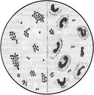Maл. 14. Стафілококи: а — чиста культура; б — у гної