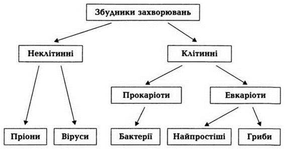 Мікроби — це найбільша за кількістю та дуже різноманітна за рівнем організації частина організмів, які населяють біосферу Землі. Об'єднують їх тільки малі розміри, тому систематизувати їх дуже складно. Збудники захворювань є серед неклітинних (віруси та пріони) і клітинних організмів. Останні поділяють на 2 великі групи: прокаріоти(доядерні) та евкаріоти (ядерні). Патогенні мікроорганізми зустрічаються серед бактерій (прокаріоти), грибів і найпростіших (евкаріоти; схема 1).