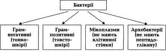 Загальновизнаною та найбільш поширеною є класифікація бактерій Д. Берджі. Згідно з визначником, виданим у 1993 р., бактерії поділяють за будовою клітинної стінки та забарвленням за Грамом на такі відділи (схема 2): Gracilicutes — тонкошкірі (грамнегативні); Firmicutes — товстошкірі (грампозитивні), Tenericutes — не мають клітинної стінки (мікоплазми), Mendosicutes — архебактерії (вони непатогенні).