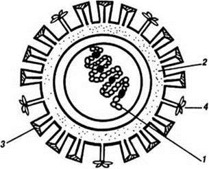 Мал. 31. Схема будови віріона вірусу грипу А: 1 — нуклеокапсид; 2 — суперкапсид із шипами; 3 — гемаглютинін; 4 — нейрамінідаза