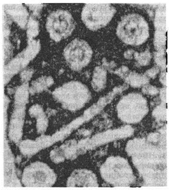 Мал. 32. Електронна мікрофотографія вірусу гепатиту В (частинки Дейна в сироватці крові)