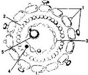 Мал. 34. Будова вірусу гепатиту В: 1 — зовнішня оболонка з HBsAg; 2 — серцевинний НВсАg; 3 — ДНК (цільний ланцюг); 4 — ДНК (дефектний ланцюг); 5 — ДНК-полімераза