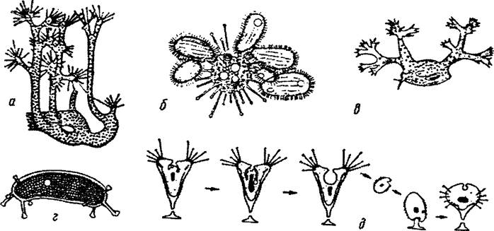 а - Dendrosoma radians (колоніальна форма); б - Sphaerophrya magna, що висмоктує одночасно п’ять інфузорій: в - Dendrocometes paradoxux, г - Allantosoma intestinalis з кишечника коня, д - схема брунькування Acineta.