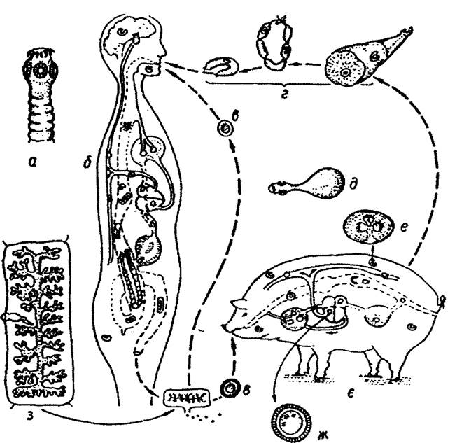 Рис. 43. Життєвий цикл Taenia solium - передній кінець дорослої особини (а), основний хазяїн (б), яйце з онкосферою (в),