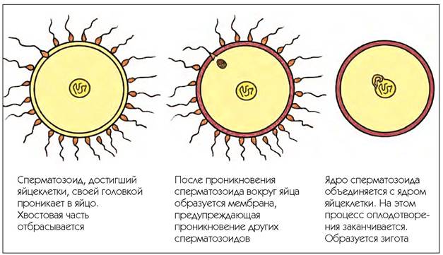 Процессоплодотворениявключает несколько этапов: проникновение сперматозоида в яйцеклетку и сквозь оболочки яйца, слияние гаплоидных ядер двух гамет с образованием диплоидной зиготы, активацию развития зиготы.