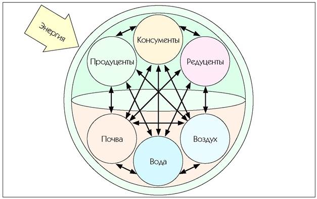 Экосистема— единство биотических и абиотических (вода, воздух, почва, минеральные вещества и т.п.) компонентов природы, в котором сообщество совместно обитающих живых организмов способно общими усилиями поддерживать круговорот веществ (рис. 62.1).