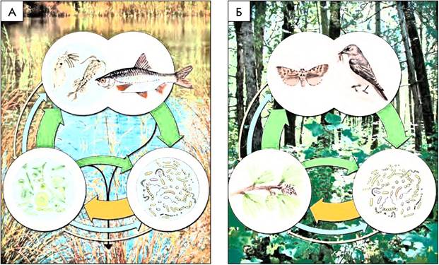 Рассмотрим для примера две хорошо знакомые экосистемы: озеро и лес (рис. 62.2).
