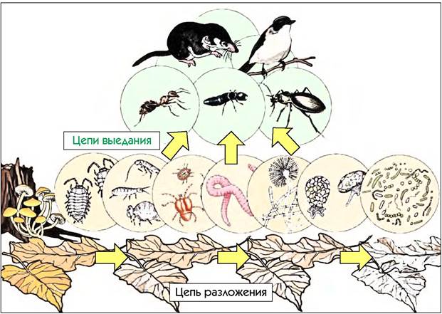 Приведённые выше цепи питания объединяют продуцентов и консументов, их называют цепями выедания. Они начинаются с растений, затем идут растительноядные организмы, а затем хищники. В цепях разложения (они наиболее распространены в лесах) большая часть продукции растений не потребляется животными, а отмирает, подвергаясь разложению редуцентами. Цепи разложения начинаются с остатков мёртвых организмов, идут к потребляющим их микроорганизмам и другим редуцентам, а от них расходятся по двум направлениям. Часть вещества и энергии организмов-редуцентов потребляется хищниками, т.е. переходит в цепи выедания. Другая часть пополняет мёртвую массу. На каждом этапе разложения мёртвой органики происходит упрощение состава веществ, вплоть до их минерализации. Для каждого этапа характерны свои виды-редуценты и их потребители-хищники (рис. 62.3).
