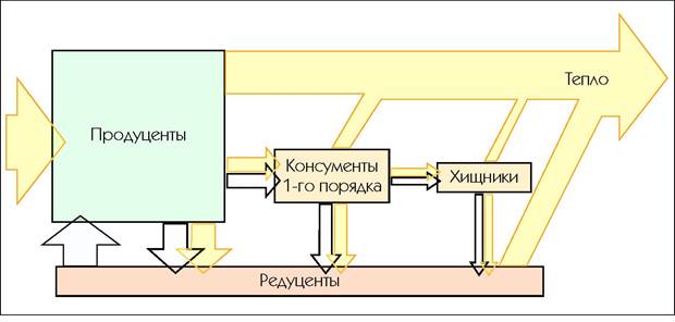 Вещество перемещается по круговороту без потерь: то, что не потребляют консументы, попадает к редуцентам. В то же время энергия Солнца, запасённая продуцентами, расходуется на жизнедеятельность и при каждом преобразовании рассеивается в виде тепла. Таким образом, энергия движется однонаправленным потоком. На новый трофический уровень переходит около 10% энергии, заключённой в биомассе предыдущего уровня.