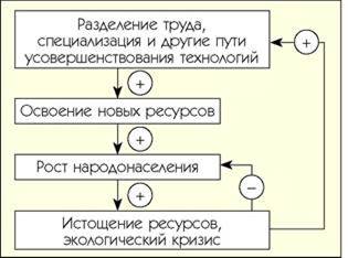 Разум — замечательное приспособление к окружающей среде. Но у него есть и оборотная сторона. Порождённый им быстрый технологический прогресс делает природные ресурсы более доступными. В результате растёт численность потребляющего их населения. Общественное разделение труда лишь ускоряет прогресс технологий. Ресурсы начинают исчерпываться. Наступает экологический кризис (рис. 53.14).