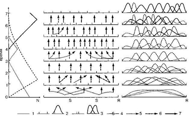 Типичная последовательность фаз филоценогенеза показана на схеме тремя разными способами в виде: динамики таксономического разнообразия (левая часть схемы); разделения лицензионного пространства и характера преемственности (стрелки) между адаптивными зонами (средняя часть схемы); плотности их упаковки (правая часть схемы). Лицензионное пространство сообщества (1); адаптивные зоны показаны двумя способами: отрезками (средняя часть схемы) или в виде распределений (правая часть схемы) в лицензионном пространстве (2); интерзональные экологические лакуны показаны промежутками между адаптивными зонами (3), нечётко выраженная граница адаптивных зон (4), слабо специализированные таксоны показаны пунктирными линиями и стрелками (5); специализированные таксоны 1-й формации — прерывистыми линиями и стрелками (6), 2-й формации — сплошными линиями и стрелками (7); мера таксономического разнообразия (N); последовательность моментов (T1—T8) геологического времени (7). По Каландадзе, Раутиану (1993а).