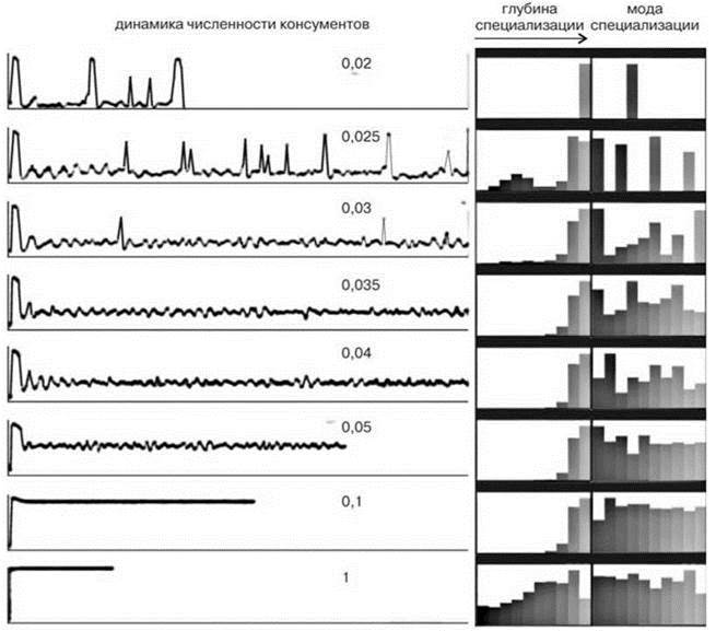 Цифры — поток энергии через сообщество. Справа: типичные “портреты сообществ”. Глубина специализации имеет 10 градаций; мода специализации отражает потребление 10 различных ресурсов. По Грабовскому (2005).