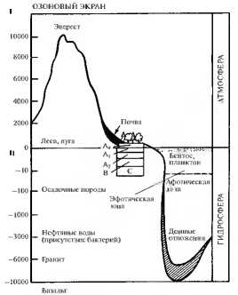 Биосфера — оболочка Земли, состав, структура и энергетика которой в существенных чертах обусловлены прошлой или современной деятельностью живых организмов. Термин “биосфера” ввел в 1873 г. австралийский геолог Э Зюсс. Общее учение о биосфере создано в 20—30-х годах XX века В.И. Вернадским. Биосфера представляет собой единство живых организмов и неорганических составных частей. Она включает часть атмосферы (тропосферу), гидросферу (океаны, моря, реки, озера) и литосферу (верхняя часть поверхности земной коры), которые взаимосвязаны сложными биогеохимическими циклами миграции веществ (биогенной миграцией атомов) и энергии; начальный момент этих циклов заключен в трансформации солнечной энергии растениями и синтезе биогенных веществ на Земле. Биосфера объединяет все современные экосистемы Земли и представляет собой глобальную экологическую систему. К общим условиям существования живых организмов относят наличие жидкой воды, ряда химических биогенных элементов и поступление солнечной энергии в диапазоне температур от —50 до +50 °С. Верхний предел жизни биосферы ограничен озоновым экраном на высоте 40—50 км, выше которого ультрафиолетовая часть солнечного спектра исключает существование жизни. Нижняя граница биосферы опускается до 3—7 км ниже поверхности суши и на 1 —2 км ниже дна Мирового океана (рис. 15.1).