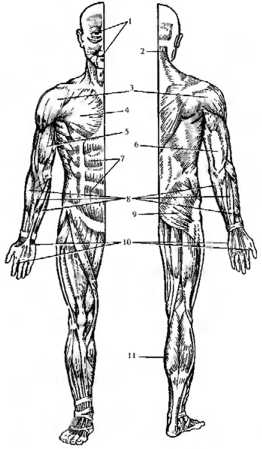 1 — мимические мышцы лица, 2 — мышцы затылка, 3 — дельтовидная, 4 — большая грудная; 5 — двуглавая, 6 — трехглавая, 7 — мышцы брюшного пресса, 8 — мышцы предплечья, 9 — ягодичная, 10 — мышцы кисти, 11 — икроножная