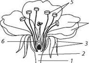 Цветок состоит из цветоножки (рис. 10, 1), цветоложа (2), околоцветника, включающего чашелистики (3) и лепестки (4), тычинок (5) и пестиков (6). Цветоножка и цветоложе — это видоизменённый стебель, остальные части цветка — видоизменённые листья.