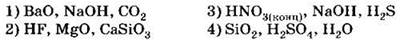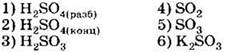 Д) H2Se Е) K2SeO3 только восстановительные свойства за счёт атомов халькогенов могут проявлять соединения 1) АБД 2) АВД 3) ВДЕ 4) АГД А5. Оксид серы (IV) взаимодействует с каждым из трёх веществ, расположенных в ряду A6. В схеме превращений A7. Концентрированная серная кислота взаимодействует с каждым из трёх веществ, расположенных в ряду A8. Сульфит натрия можно отличить от сульфида натрия с помощью 1) раствора хлорида аммония 2) раствора гидроксида калия 3) лакмуса 4) соляной кислоты А9. Какие из утверждений о кислороде и его свойствах верны? А. В свободном состоянии кислород способен существовать в виде двух аллотропных модификаций. Б. Кислород взаимодействует с галогенами с образованием оксидов. 1) верно только . 2) верно только . 3) верны оба суждения 4) неверны оба суждения А10. Минимальный объём 10%-го раствора гидроксида калия с плотностью 1,08 г/мл, который необходим для поглощения сероводорода объёмом 6,72 л (н. у.), равен 1) 155,6 мл . 2) 168 мл 3) 311,1 мл . 4) 336 мл Часть В. Тестовые задания с выбором трёх правильных ответов (В1) и на соответствие (В2 и В3) В1. Для сероводорода справедливы утверждения 1) при обычных условиях — газ с характерным запахом 2) хорошо растворим в воде 3) водный раствор является сильной кислотой 4) не способен к образованию кислых солей 5) взаимодействует с концентрированной азотной кислотой 6) проявляет сильные восстановительные свойства В2. Установите соответствие между реагирующими веществами и продуктами их взаимодействия. РЕАГИРУЮЩИЕ ВЕЩЕСТВА ПРОДУКТЫ ВЗАИМОДЕЙСТВИЯ В3. Установите соответствие между уравнением реакции и свойством элемента серы, которое он проявляет в реакции. УРАВНЕНИЕ РЕАКЦИИ СВОЙСТВО СЕРЫ 1) окислитель 2) восстановитель 3) и окислитель, и восстановитель 4) не проявляет окислительно-восстановительных свойств Часть С. Задания с развёрнутым ответом С1. Составьте уравнения реакций в соответствии со схемой изменения степеней окисления атомов серы: С2. В 150 мл 20% -го раствора серной кислоты с плотностью 1,14 г/мл растворили 4 г оксида серы (VI). К полученному раствору добавили 100 мл 18%-го раствора хлорида бария с плотностью 1,18 г/мл. Определите массу выпавшего осадка и массовые доли веществ в растворе над осадком. ВАРИАНТ 2 Часть А. Тестовые задания с выбором одного правильного ответа А1. Для всех элементов VIA группы справедливо утверждение 1) являются неметаллами 2) встречаются в природе в свободном состоянии 3) содержат два неспаренных электрона на внешнем уровне 4) имеют высшую степень окисления +6 А2. В ряду химических элементов Ро — Те — Se — S — О возрастает 1) число внешних электронов 2) высшая степень окисления атомов 3) низшая степень окисления атомов 4) электроотрицательность А3. В перечне веществ только окислительные свойства за счёт атомов халькогенов могут проявлять соединения 1) АБЕ 2) ВГЕ . 3) БДЕ 4) АГД А4. Сероводород взаимодействует с каждым из трёх веществ, расположенных в ряду A5. Оксид серы (VI) взаимодействует с каждым из трёх веществ, расположенных в ряду А6. В схеме превращений A7. Концентрированная серная кислота взаимодействует с каждым из трёх веществ, расположенных в ряду А8. Сульфат натрия можно отличить от сульфита натрия с помощью 1) хлорида бария 2) хлорида калия 3) раствора гидроксида калия 4) соляной кислоты А9. Какие из утверждений о сере и её свойствах верны? А. В свободном состоянии сера способна к образованию нескольк