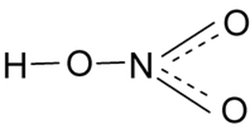Опытным путём доказано, что в молекуле азотной кислоты между двумя атомами кислорода и атомом азота две химические связи абсолютно одинаковые – полуторные связи. Степень окисления азота +5, а валентность равна IV.