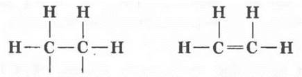 Установить строение этилена удалось только в 1860 г. А. М. Бутлерову. Он синтезировал этилен другим способом и установил, что в его молекуле на два атома углерода приходится четыре атома водорода. В соответствии с формировавшейся тогда теорией химического строения нельзя было изобразить структурную формулу этилена, не нарушив валентности атомов. Ведь свободных валентностей у атомов в молекуле быть не должно! На помощь приходит гениальная догадка: атомы углерода связаны не одной, а двумя валентностями.
