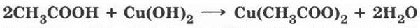 4. Уксусная кислота способна взаимодействовать с основаниями, причем не только со щелочами, но и нерастворимыми в воде. Если на свежеприготовленный осадок гидроксида меди (II) подействовать раствором уксусной кислоты, осадок исчезает, образуется голубой раствор соли меди. Учащиеся без труда называют эту соль — ацетат меди (II):