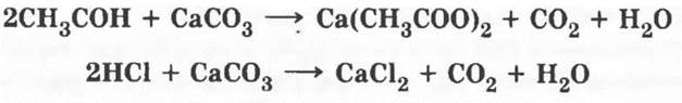 5. Карбоновые кислоты хотя и слабые, но сильнее некоторых неорганических, например угольной. Поэтому уксусная кислота способна вытеснять угольную из ее солей — карбонатов. Если в пробирку с порошком карбоната кальция добавить раствор уксусной кислоты, наблюдается бурное выделение углекислого газа в соответствии с реакцией обмена:
