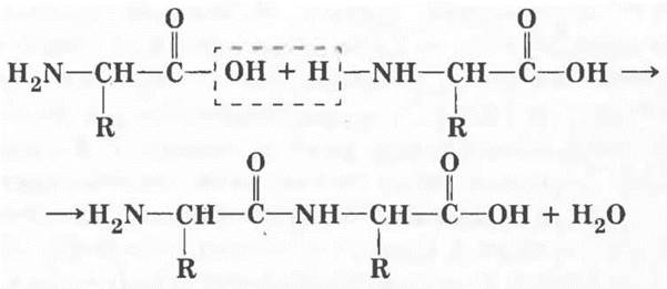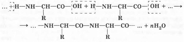 Нетрудно заметить, что в дипептиде, как и в аминокислоте, имеется по одной свободной функциональной группе —СООН и —NH2. Следовательно, он может удлинять цепочку в обе стороны за счет конденсации с другими молекулами аминокислот. Образуется полимерная молекула — полипептид. В результате образования такой макромолекулы происходит выделение побочного продукта — воды. Такие реакции носят название поликонденсации.