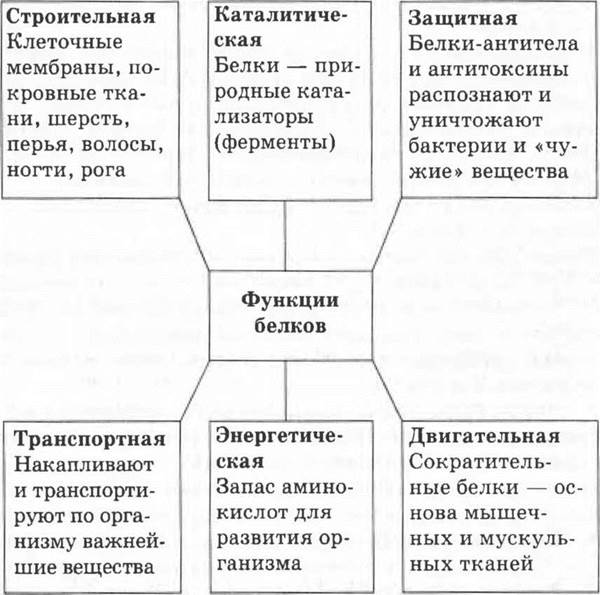 Функции белков в организме очень разнообразны. Основные из них учитель может продемонстрировать в виде схемы, заранее нарисованной на доске или выполненной в виде плаката (схема 4).