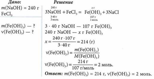 К раствору, содержащему избыток хлорида железа(Ш), добавили раствор, содержащий 240 г гидроксида натрия. Определите массу и количество образовавшегося гидроксида железа(III).