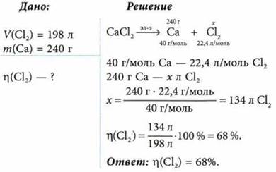 При электролизе расплава хлорида кальция на аноде выделился хлор объемом 198 л (н. у.), а на катоде — кальций массой 240 г. Предполагая, что практический выход кальция составляет 100%, вычислите практический выход хлора.