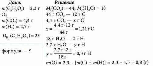При сгорании 2,3 г органического вещества в избытке кислорода образовалось 4,4 г оксида углерода(IV) и 2,7 г воды. Относительная плотность паров этого вещества по водороду равна 23. Из каких элементов состоит вещество? Определите его формулу.