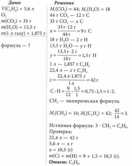 При сжигании 5,6 л газообразного углеводорода образовалось 33 г СO2 и 13,5 г воды. Масса 1 л газа — 1,875 г. Определите формулу вещества.