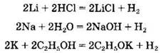 Химические свойства щелочных металлов. Щелочные металлы обладают наибольшей среди всех металлов химической активностью, являясь очень сильными восстановителями. Так, они вытесняют водород не только из кислот, но и из воды и даже из спиртов: