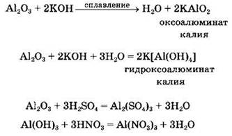 Наиболее важное соединение алюминия — его оксид. И оксид, и гидроксид алюминия, проявляя амфотерные свойства, взаимодействуют как с кислотами, так и с щелочами (или другими реагентами кислотной или основной природы), например: