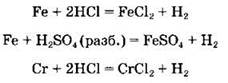 Железо, цинк и хром, находясь в электрохимическом ряду металлов до водорода, взаимодействуют с кислотами, выделяя водород, например: