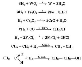 В органической химии реакции присоединения водорода называются реакциями гидрирования. Среди рассмотренных примеров только при взаимодействии с металлами водород проявляет окислительные свойства, во всех других реакциях водород действует как восстановитель.