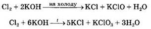 На холоду хлор окисляется до степени окисления +1 с образованием гипохлорита калия, а при нагревании — до степени окисления +5 с образованием хлората калия.