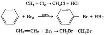 Галогены могут взаимодействовать не только с неорганическими, но и с органическими веществами, вступая с ними в реакции присоединения или замещения, например: