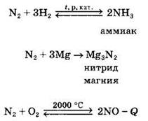 Химические свойства азота. Как простое вещество азот состоит из двухатомных молекул N2. При обычных условиях он обладает весьма низкой реакционной способностью. Это связано с высокой прочностью тройной связи в молекуле азота: для разрыва тройной связи необходима энергия 945 кДж/моль. И даже при нагревании активность азота возрастает незначительно. Так, при нагревании азот взаимодействует с водородом, кислородом, активными металлами: