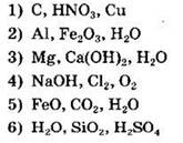Как видно из названий веществ, все они принадлежат одному классу — классу оксидов, но только относятся к различным группам. Так, например, оксид углерода (IV) (А) — кислотный оксид, со слабовыраженными окислительными свойствами. Поэтому для него возможны реакции с каждым из веществ группы 3, представленной основанием (Са(ОН)2), водой и сильным восстановителем — магнием. Оксид меди (II) (Б) — основный оксид, с окислительными свойствами. Поэтому для него характерны взаимодействия с веществами, проявляющими кислотные и восстановительные свойства: HNO3, С и Сu (ряд 1). Для основного оксида — оксида кальция (В) возможны реакции с каждым веществом ряда 6, образованного водой, кислотным оксидом (SiO2) и кислотой (H2SO4). Оксид углерода (II) (Г) — несолеобразующий оксид, с сильными восстановительными свойствами. Для него характерны реакции с окислителями кислородом и хлором, а также гидроксидом натрия (ряд 4).